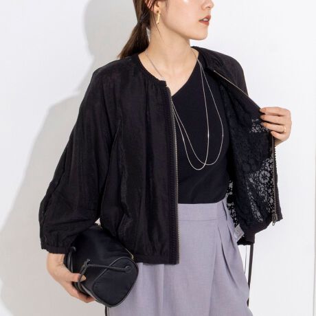 ・程よい光沢のシアー生地から透ける裏面のレースが、奥行き感を醸し出すリバーシブル・ブルゾン
