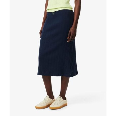 [型番:JF9831-10]ブランドネームロゴモチーフを透かし編みで表現したニットミディスカート・環境保全に配慮したオーガニックコットン仕立てのニット素材・レース調のブランドネームロゴモチーフを編みで表現・ウエストに波型の飾りテープと、メタルワニロゴチャーム付きリボンを配置・腰まわりに沿い、裾に向かって広がるフィット&フレアカット・背面右腰にワニロゴパッチRegular Fit