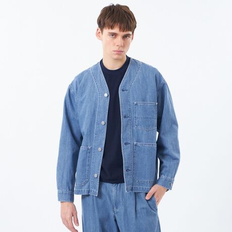Gジャンやワークジャケットの要素を取り入れたノーカラーカバーオール。オーバーサイズのゆったり感と、長すぎず、短すぎない着丈で、独特な抜け感をもたらすシルエットに仕上げたカジュアルアウターです。