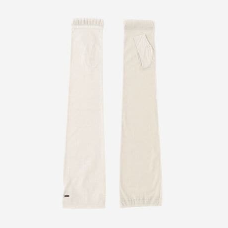 UVカットアームカバーです。遮蔽率は、ブラック97%以上、ベージュは80%以上になります。甲側は、しなやかでソフトな風合いの素材を使用。ハイゲージで上品な光沢感のある接触冷感素材になります。掌側はメッシュ素材を使用し、通気性に優れています。柔らかでストレッチ性のあるメッシュなので、着け心地がよいです。内側腕部分にはゴムシャーリングを入れているので、適度に腕にフィットし、ずり落ちにくくなっています。50cm丈のひじ上までカバーされるデザインです。