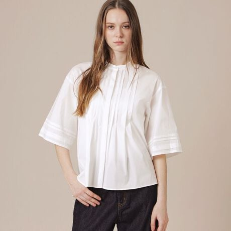 フロントと袖口に施したタックがポイントのブラウスです。ゆとりのあるシルエットで、リラックス感のある着こなしが決まるアイテムです。一枚ではもちろん、フロントを開けてタンクトップの上などにさらりと羽織るのもおすすめです。同素材のワンピース(品番:G5J15715)もご用意しております。