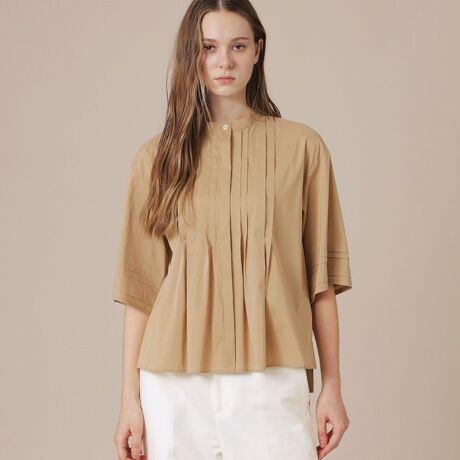 フロントと袖口に施したタックがポイントのブラウスです。ゆとりのあるシルエットで、リラックス感のある着こなしが決まるアイテムです。一枚ではもちろん、フロントを開けてタンクトップの上などにさらりと羽織るのもおすすめです。同素材のワンピース(品番:G5J15715)もご用意しております。