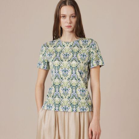 様々なフラワーが咲く、ボタニカルガーデンをモチーフにした柄を生かした、シンプルなトップスです。着心地の良い素材でコーディネートの主役になるアイテムです。日本の縫製工場で繊細に仕立てています。