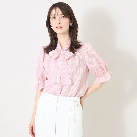 一続きのボウタイが上品な表情をつくるデザインブラウス。