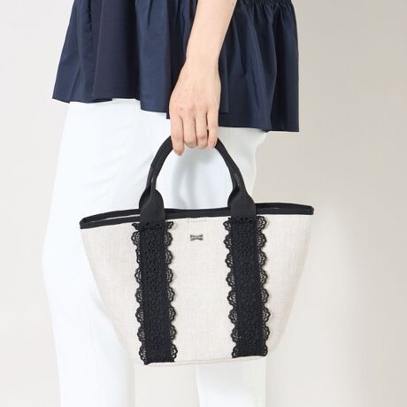 [型番:W5126726__]スカラップレースバスケット麻混へリンボンにさりげなくシルバーラメの入ったバッグ本体にブラックのレースを合わせたバスケットです。持ち手から続く縦のラインに、黒のスカラップ調のフラワーレースをあしらい可愛いくしあげました。ショルダーストラップは取り外し可能なのでお好みで使い分けができます。※この商品はサンプルでの撮影を行っています。実際の商品とイメージ、仕様が異なる場合がございます。
