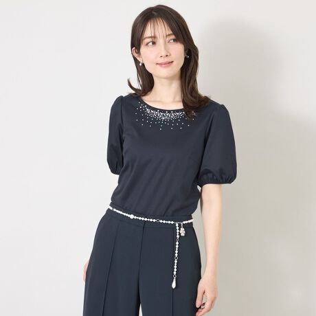 ギャザー袖が柔らかなアクセントになり、襟元にはホットフィックスとビジュー刺繍を贅沢にあしらった華やかな1枚。