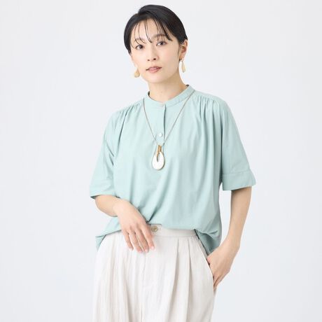 細かいギャザーを入れ、軽く着られるフレンチスリーブブラウス。体から程よく離れるシルエットで、きれいに見える形に仕上げています。ジャージー素材の快適さとブラウスらしい上品さを合わせた、使い勝手のいい一枚です。