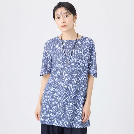 薄くなめらかな質感と適度なストレッチ性を備えたハイテンション素材。軽やかさとしなやかさがあり、動きを妨げず快適に着用できます。接触冷感機能付き。コンパクトに畳めて扱いやすく、トラベルウェアにも最適。アーカイブ柄のドットを使用し、カジュアルすぎずエレガントにも着られる表情に仕上げています。