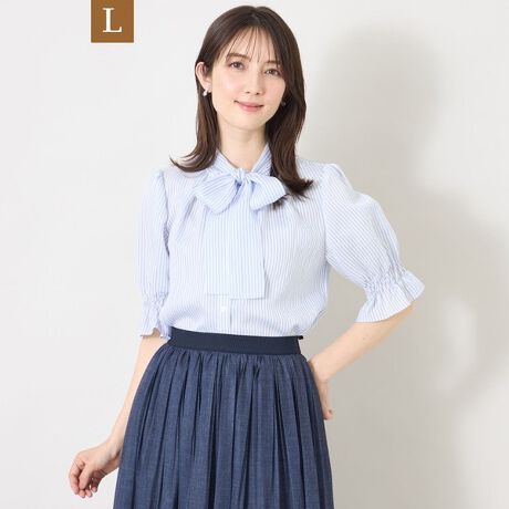 一続きのボウタイが上品な表情をつくるデザインブラウス。