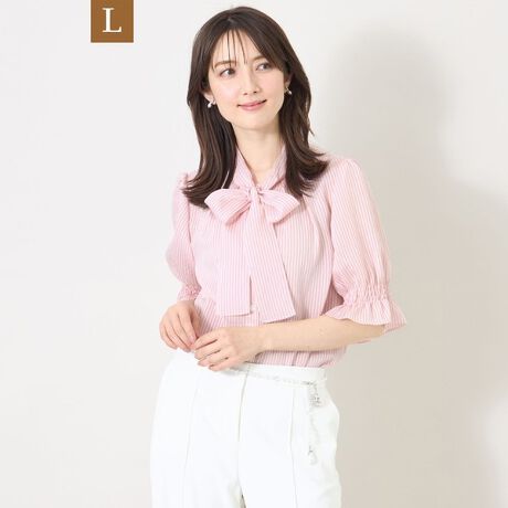 一続きのボウタイが上品な表情をつくるデザインブラウス。