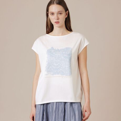 ブランドオリジナルのエレガントで爽やかなリーフ柄を優しい色合いで表現したトップスです。1枚でも同柄のアウターや帽子、バッグをあわせてコーディネイトをお楽しみいただけます。日本でプリントし日本の縫製工場で繊細に仕立てています。