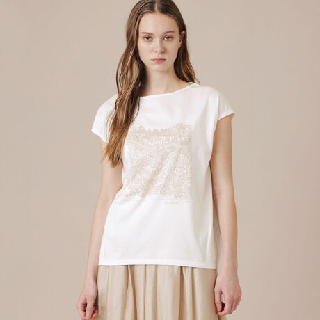 ブランドオリジナルのエレガントで爽やかなリーフ柄を優しい色合いで表現したトップスです。1枚でも同柄のアウターや帽子、バッグをあわせてコーディネイトをお楽しみいただけます。日本でプリントし日本の縫製工場で繊細に仕立てています。