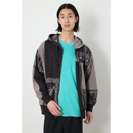 ■ポイント無地とバンダナ柄、素材の表と裏を絶妙に掛け合わせたデザインのジップパーカーです。■ディテールミニ裏毛素材を繋ぎあわせたリメイク感満載のパーカーです。掠れた様なプリント表現もヴィンテージ感のある雰囲気に仕上がっています。■スタイリングデニムパンツやジョガーパンツ、イージーパンツやトラックパンツなど様々なボトムと相性抜群。■生地※ONE&ONLYタグ付きインディゴ染めに部分脱色加工を施し、ヴィンテージライクな風合いに仕上げています。■透け感:なし■裏 地:なし■伸縮性:ややあり■光沢感:なし※お取り扱い上のご注意プリント箇所は着用・洗濯によリ白化、剥離する場合があります。インディゴ染め製品のため、湿った状態で他の衣類と重ねて放置すると色移りの原因となりますのでご注意ください。また、濃色と淡色の組み合わせでの着用はなるべくお控えください。[注意事項]※画像の商品はサンプルです。実際の商品と仕様、加工が若干異なる場合があります。※画像の商品は光の照射や角度、お使いのモニター環境により、実物と色味が異なる場合がございます。※着用、お取り扱いの際は、アテンションタグをご確認ください。