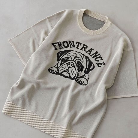 〇ドッグ&キャットモチーフを、編み目が細かく軽やかなニットで表現。プリントではなく糸で柄を描くことで、透けにくく上品な表情に仕上げたWEB限定ニット