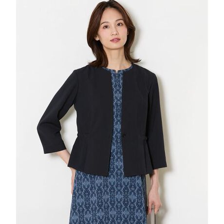 軽く羽織るだけできちんと見えするノーカラーデザイン。フロントは一つ釦で、ウエスト内側にドローストリングを施し、シルエットの調整が可能です。ほどよく広がるペプラムシルエットが女性らしいバランスを演出。すっきりとした7分袖で、暑い季節でも軽やかに着こなせます。裏地なし。ポケットなし。