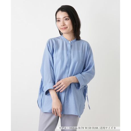 シルクをブレンドした上質感と滑らかな肌触りが魅力のバンドカラーブラウスです。ウエスト部分のドロストを絞ることでシルエットの調節が行え、メリハリのある着こなしを叶えます。フロントは比翼仕立てのボタン開閉ですっきりとした印象に。カフス部分に施されたスリットを活かし、袖口を折り返して手元にこなれた抜け感を演出するのもおすすめです。ヒップにかかる絶妙な丈感が体型をカバーしつつ、エレガントな大人カジュアルを爽やかに彩る一枚です。