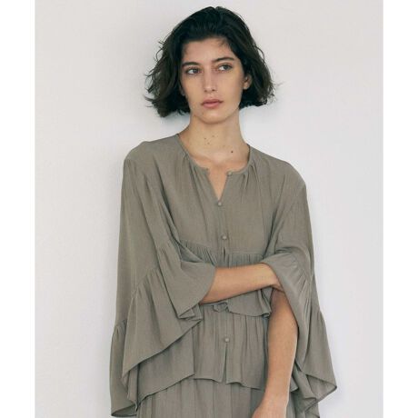 バタフライスリーブが作り出す、流れるようなラインが美しいティアードブラウスです。袖と身頃に配された柔らかなギャザーが、女性らしくエレガントなシルエットを描きます。フロントには共布のくるみボタンとループを採用し、細部まで丁寧に仕立てました。薄手のさらりとした素材感が動くたびに軽快な表情を見せ、同素材のスカートと合わせたセットアップスタイルならより一層クラス感のある着こなしが完成します。