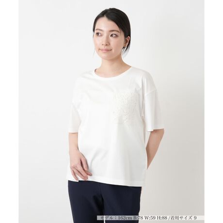 シンプルな無地のコットンをベースに、左胸のポケット部分にボタニカルレースをあしらったクルーネックカットソーです。異素材のコントラストがさりげないアクセントとなり、カジュアルな中にも大人の遊び心を感じさせます。肩のラインを落としたドロップショルダーがリラックス感のあるこなれたシルエットを演出。肌当たりの良い素材を使用しているため、デイリーユースでも快適な着心地をキープします。