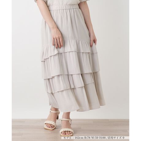 ボリューム感たっぷりのティアードデザインが目を惹くロングスカートです。段ごとにたっぷりとギャザーを寄せることで、さりげなく揺れる柔らかなニュアンスを表現しました。肌当たりのよい軽やかな素材感とウエストのゴム仕様により、リラックスした穿き心地を実現しています。同素材のトップスと合わせたセットアップでの着用はもちろん、シンプルなカットソーとも相性が良く、華やかなコーディネートを叶える一枚です。