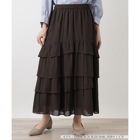 ボリューム感たっぷりのティアードデザインが目を惹くロングスカートです。段ごとにたっぷりとギャザーを寄せることで、さりげなく揺れる柔らかなニュアンスを表現しました。肌当たりのよい軽やかな素材感とウエストのゴム仕様により、リラックスした穿き心地を実現しています。同素材のトップスと合わせたセットアップでの着用はもちろん、シンプルなカットソーとも相性が良く、華やかなコーディネートを叶える一枚です。