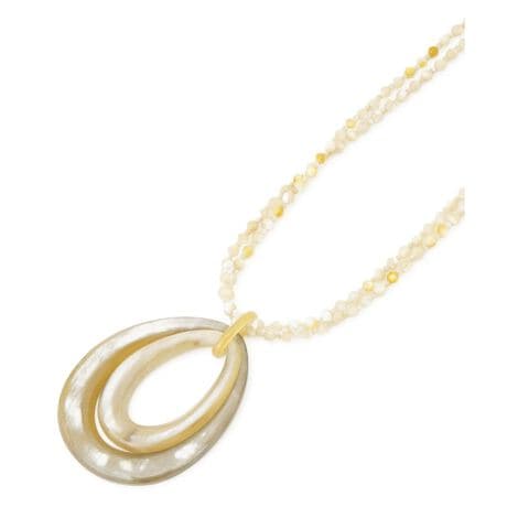 天然素材ならではの温かみと、洗練されたデザインが融合したペンダント。水牛から作られたオーバルパーツと、柔らかな光を放つシェルを組み合わせることで、程よい存在感のあるデザインに仕上げました。明るめのアースカラーは肌馴染みが良く、どんな色のお洋服にも美しく映えます。シンプルなTシャツやニットの胸元に添えるだけで、装いにナチュラルで上品なアクセントをプラス。長さの調節が可能なので、トップスのネックラインに合わせて最適なバランスでお楽しみいただけます。季節感あふれる、大人のためのアクセサリーです。