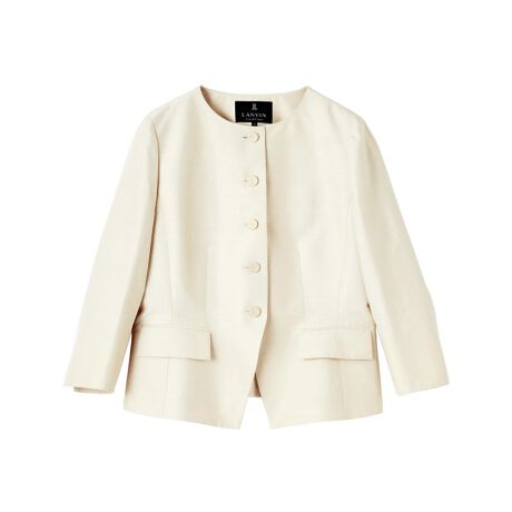 クラシックを再解釈したレトロ・モダンなこのジャケットは、襟元すっきりな丸首とくるみボタンが品の良い愛らしさを添え、バックの巧みな切り替えが立体的で美しいシルエットを描きます。袖口のスリットや細部の仕立てが優雅な動きを演出し、クチュールの香りをまとった一着が、装いに格別の品格をもたらします。