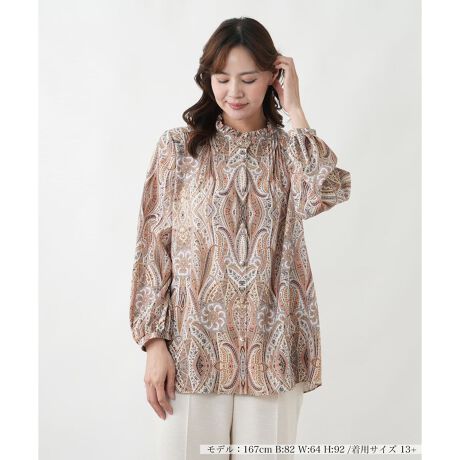 色彩豊かなペイズリープリントが目を惹く、チュニック丈のブラウス。エリカ社のアーカイブから選ばれたこの美しいプリントは、まるで絵画のような芸術性を感じさせます。シワになりにくい、軽やかでしなやかなポリエステルデシン素材を使用。襟元と後ろヨーク下にあしらわれた繊細なピンタックが、動くたびに優雅な表情を生み出します。ヒップが隠れる安心の着丈で、体型を気にせずお召しいただけます。細身のパンツと合わせるだけで、気品あふれる大人のリラックススタイルが完成します。