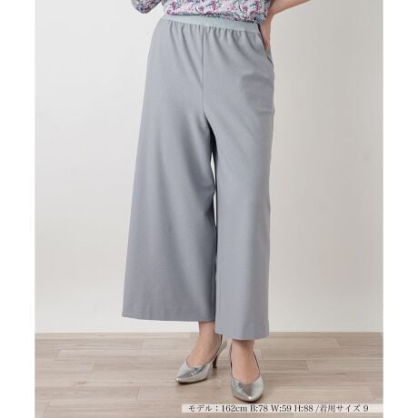 やや薄手の軽やかなストレッチ素材を使用したワイドパンツです。動きを妨げず、アクティブなシーンでもストレスフリーな穿き心地を実現します。ウエストは総ゴム仕様になっており、お腹周りを締め付けず快適なフィット感をキープ。広がりすぎないストレート寄りのリラックスシルエットが脚のラインを美しくカバーしつつ、都会的で洗練された印象を演出。シンプルなデザインで合わせるトップスを選ばず、オンオフ問わずデイリーに活躍する一本です。