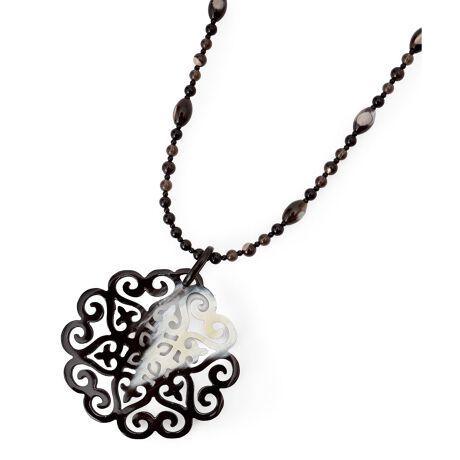 水牛パーツに繊細な透かし彫りを施したトップが、優美な存在感を放つペンダント。職人の手仕事が感じられる、アーティスティックなデザインが魅力です。シックなカラーで統一された、水牛やウッドなどの贅沢な天然素材を連ねたネック部分が、トップの美しさを引き立て、胸元に洗練された雰囲気をもたらします。アジアンテイストでありながら、モダンな装いにもマッチする普遍的なデザイン。リネンシャツやシンプルなワンピースに合わせるだけで、上級者のスタイリングが完成します。