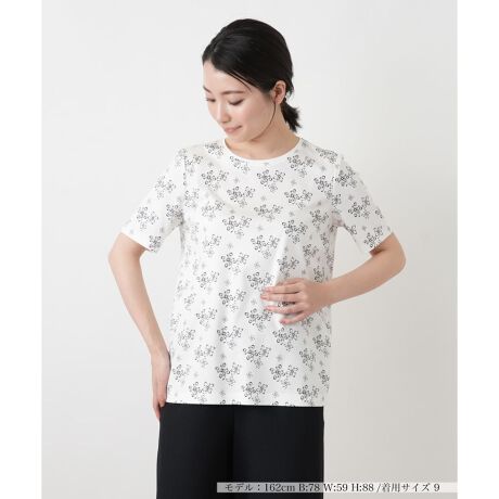 ブランドのイニシャルを優雅なボタニカル調に昇華させた、独自の総柄プリントカットソーです。オートスクリーン顔料プリントを施すことで発色が際立ち、大人の装いに気品ある華やぎを添えてくれます。首元はベーシックなクルーネックで、程よくゆとりのあるシルエットがリラックスした着心地と洗練された印象を演出。カーディガンなどの羽織りから柄をのぞかせたレイヤードスタイルも美しく決まり、日常のコーディネートを格上げしてくれる一枚です。