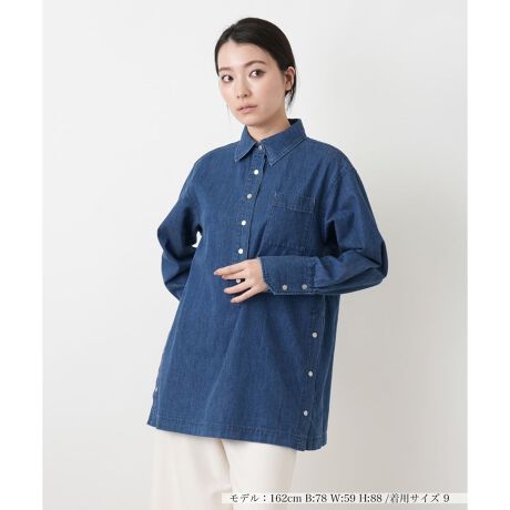 カジュアルなワークテイストが漂う、ワンポケットのデニムシャツです。フロントは着脱がスムーズなハーフプラケット仕様で、フラットなスナップボタンがアクセントに。カフスや両裾のサイドスリットにも同様のボタンを配しており、開閉することでシルエットにニュアンスを加えた着こなしも可能。ヒップラインを覆う長めの丈感と程よいゆとりがリラックス感のある大人の装いを演出。一枚着としてはもちろん、季節の変わり目のライトアウターとしても重宝する汎用性の高いアイテムです。
