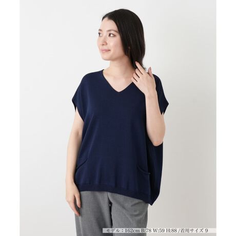 レーヨンにナイロンをブレンドして編み込んだ、さらりと滑らかな肌触りのVネックニットベストです。絶妙なバランスで開いたネックラインやゆとりのあるシルエットが大人の女性らしいナチュラルなリラックス感を演出。落ち感のあるフロントポケットがシンプルなデザインにさりげないアクセントを添えています。季節の変わり目に重宝し、コーディネートを上品に格上げしてくれる着回し力の高いトップスです。