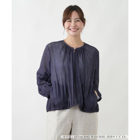 夏の装いに軽やかさと華やかさをプラスする、無地ライクなブルゾン。軽くて肌離れが良い素材感が、これからの季節におすすめです。繊細な素材感が上品な透け感を演出し、涼しげな印象を与えます。インナーにはパワーネットを使用しており、快適な着心地と美しいシルエットを両立。すっきりとしたノーカラーの丸首デザインは、どんなインナーとも相性抜群です。ワンピースの上に羽織ってフェミニンに、パンツスタイルに合わせてスタイリッシュにと、夏のレイヤードスタイルを存分に楽しめます。ご自宅で手軽にお手入れできるのも嬉しいポイントです。