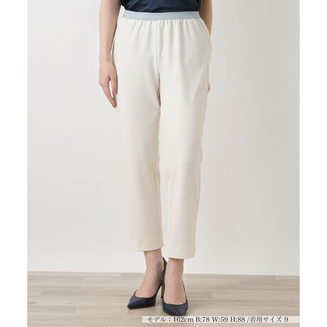 ストレッチ素材を使用した、快適な穿き心地のクロップドパンツです。裾に向かって細くなるスマートなテーパードシルエットが脚のラインをすっきりと見せ、都会的で洗練された印象を与えます。ウエストは総ゴム仕様になっており、お腹周りを締め付けずリラックスしたフィット感をキープ。足首が覗く絶妙なクロップド丈は、スニーカーからパンプスまで幅広いシューズと相性が良く、全体を軽やかにまとめてくれます。
