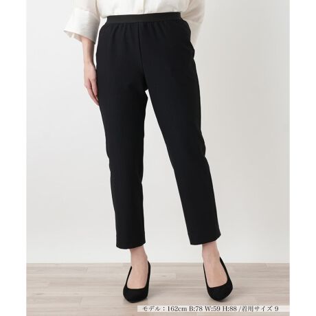ストレッチ素材を使用した、快適な穿き心地のクロップドパンツです。裾に向かって細くなるスマートなテーパードシルエットが脚のラインをすっきりと見せ、都会的で洗練された印象を与えます。ウエストは総ゴム仕様になっており、お腹周りを締め付けずリラックスしたフィット感をキープ。足首が覗く絶妙なクロップド丈は、スニーカーからパンプスまで幅広いシューズと相性が良く、全体を軽やかにまとめてくれます。