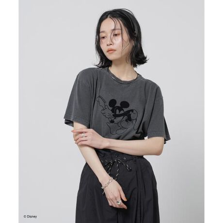 ギターを弾く「ミッキーマウス」のプリントがキャッチーなTシャツ。ユーズド感漂うデザインがこなれたスタイルに導いてくれるアイテムです。