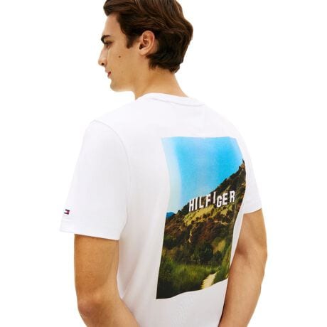バックをフォトプリントで飾ったTシャツ。本体はシンプルにまとめてビビットなグラフィックを引き立てつつ、着合わせに困らない柔軟性を高めています。左胸にはHILFIGERのサインボードロゴを配し、さりげなく前後でデザインをリンク。シルエットは着回しの効くレギュラーフィットを採用しています。