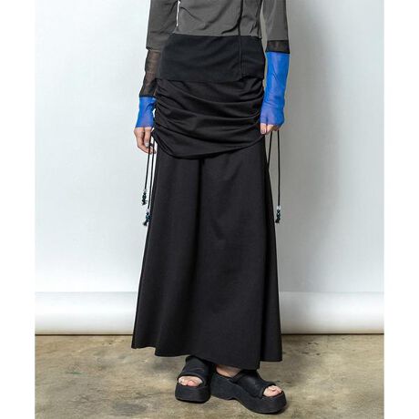 左右アシンメトリーに設定したギャザーミニスカートをレイヤードしたフレアロングスカート。