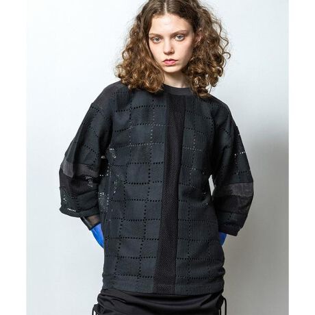 透け感の異なる2種類の四角を組み合わせたようなクールな印象のレースを使用したプルオーバー。