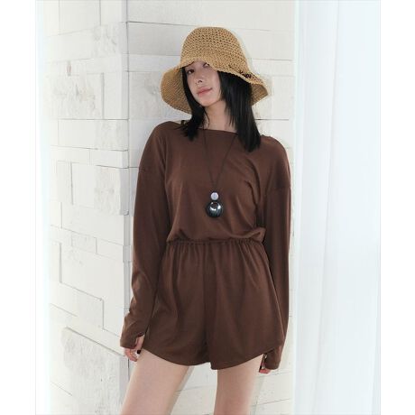 ウエストはゴム入りで高い位置で留まる為スタイルアップが期待でき、長めに設定された袖は手の甲まで日差しをカット。