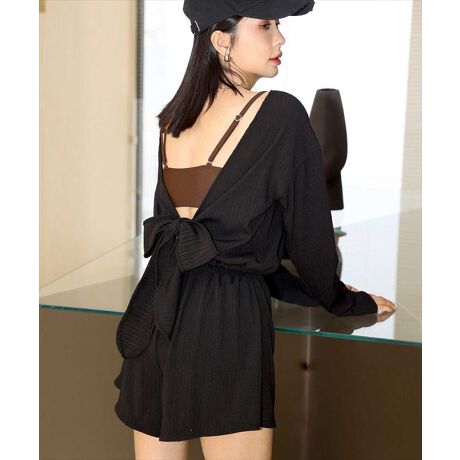 広めに開いた背中には大きめのリボンが施されており、ゆるっとしたニュアンスがこなれ感を演出。