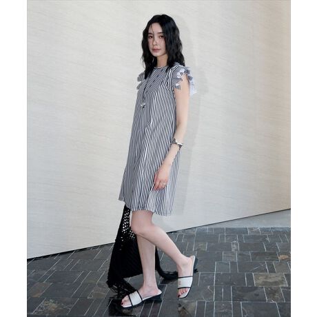 縦を強調するラインとデコルテをすっきり覆うネックラインがフォーマルなニュアンスを演出し、甘いフリルでリッチ感をプラス。