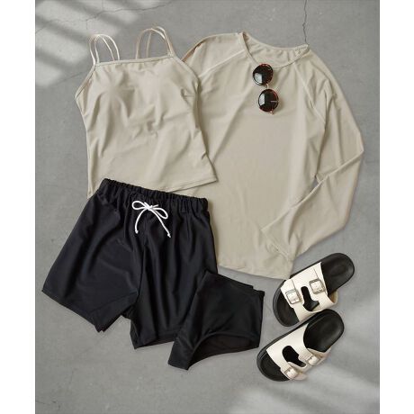 ラッシュガード、キャミソールビキニ、ショーツ、ショートパンツの4点セットです。