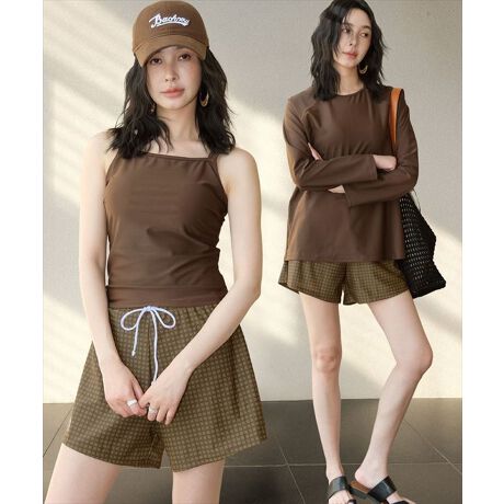 キャミソールスタイルの時は、ラッシュガードを腰や肩に巻いて着こなしを楽しんでもOK。