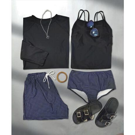 ラッシュガード、キャミソールビキニ、ショーツ、ショートパンツの4点セットです。