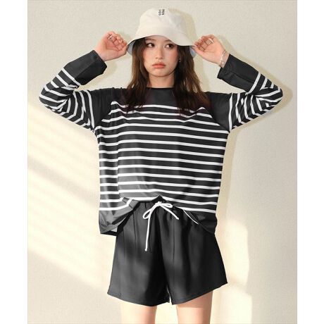 強い日差しから肌を守るラッシュガードは、細いボーダーにラグランスリーブでトムボーイ感をON。