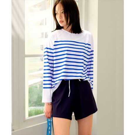 強い日差しから肌を守るラッシュガードは、細いボーダーにラグランスリーブでトムボーイ感をON。