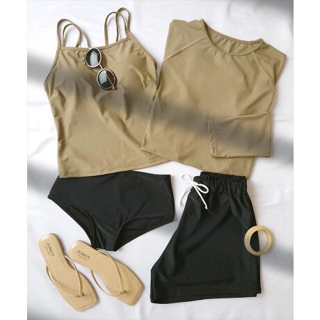 ラッシュガード、キャミソールビキニ、ショーツ、ショートパンツの4点セットです。