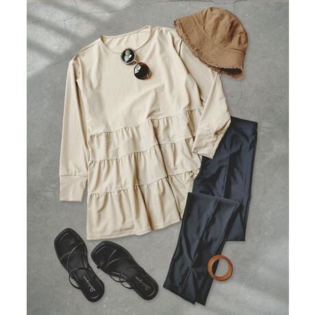 ティアードフリルのような甘いフレアがガーリーにまとめるラッシュガードは、着丈が長めなのでお尻まで体型カバー。