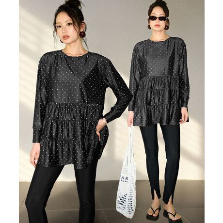 ティアードフリルのような甘いフレアがガーリーにまとめるラッシュガードは、着丈が長めなのでお尻まで体型カバー。